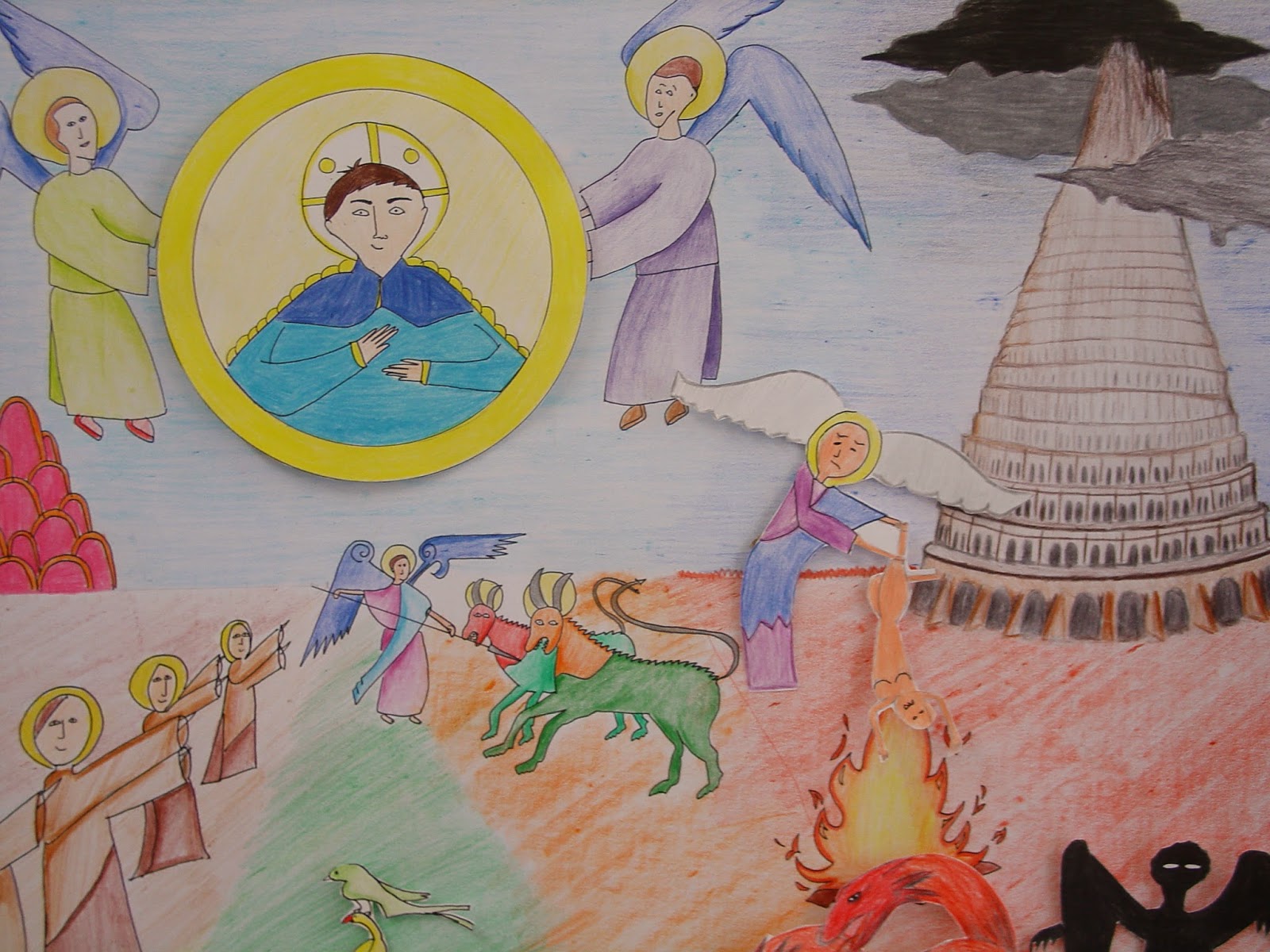 Este es el resultado de lo aprendido durante la ESO y puesto en práctica en una versión personal de los beatos de Liébana y El Escorial, buscando como valor añadido e la representación del espacio y por supuesto el respeto al mensaje de estos textos medievales.