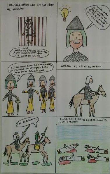 El trabajo final de 1º de ESO. ha sido un cómic sobre la figura del cid, su leyenda, sus batallas y su historia. Se perseguía crear un cómic donde la variedad de planos, para hacer el relato más dinámico, fuera la tónica así como la modulación de la línea y el uso de líneas de movimiento como elementos propios del lenguaje del cómic.